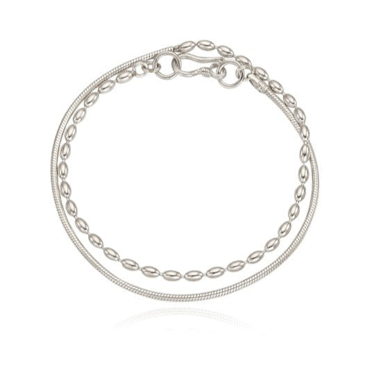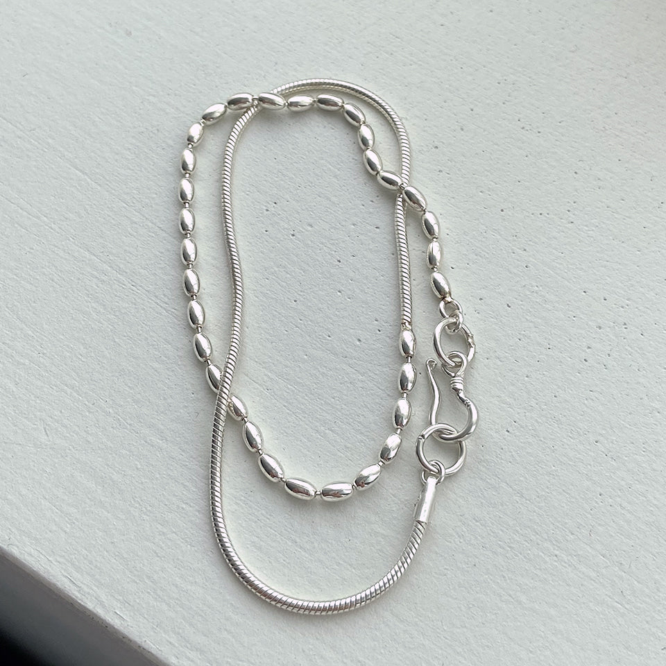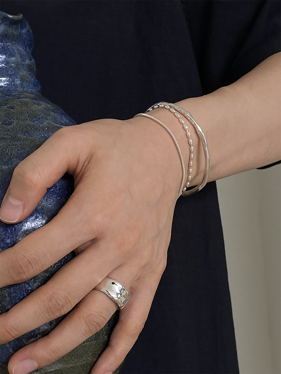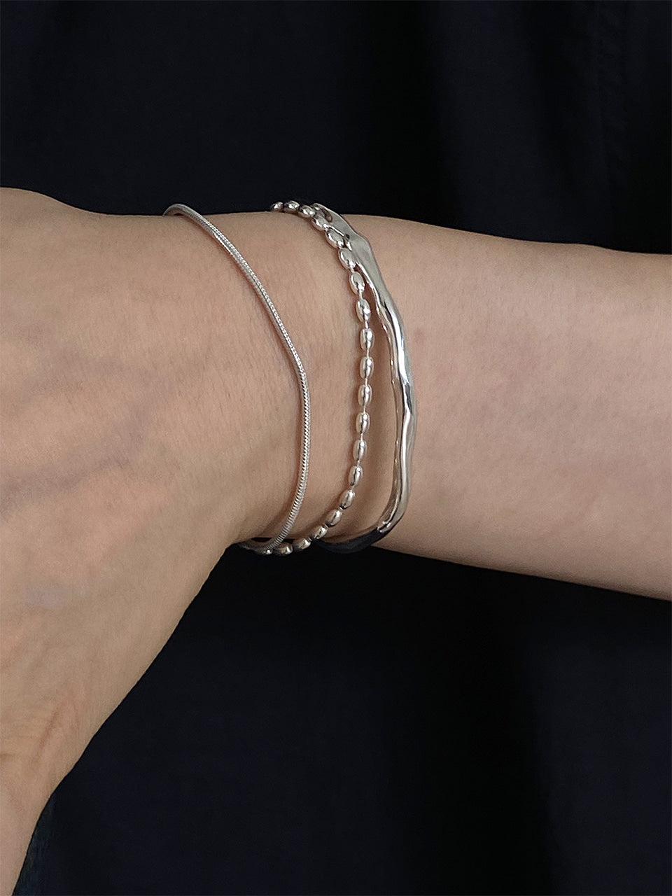 這款手鍊由銀色金屬線條和蛋形圓球設計組合而成,視自己手腕長度決定繞幾圈配戴,看起來就像兩個手鐲疊在一起,營造出獨一無二的感覺。